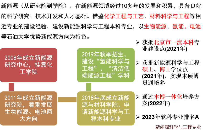 基于對(duì)能源行業(yè)發(fā)展趨勢(shì)的判斷和思考,中國石油大學(xué)立足國家能源戰(zhàn)略需求和學(xué)科發(fā)展前沿布局,2018年在原新能源研究院的基礎(chǔ)上,成功申辦新能源科學(xué)與工程專業(yè),2019年第一次招收本科生70人。2020年獲批新能源科學(xué)與工程交叉博士學(xué)位點(diǎn),2021年獲批新能源科學(xué)與工程碩士學(xué)位點(diǎn),實(shí)現(xiàn)新能源方向本、碩、博全方位培養(yǎng)。2021年,新能源科學(xué)與工程本科專業(yè)入選北京市一流專業(yè)建設(shè)點(diǎn)。2022年,通過新能源本博一體化培養(yǎng)方案。2023年軟科新能源專業(yè)排名A。2024年與經(jīng)管學(xué)院合辦能源經(jīng)濟(jì)與新能源工程雙學(xué)士學(xué)位專業(yè)。